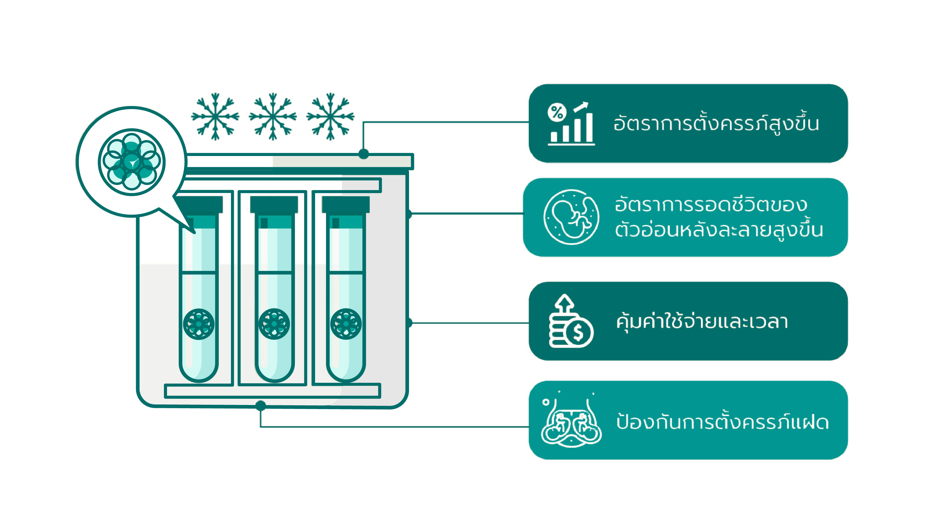 – สามารถเก็บรักษาตัวอ่อนที่มีคุณภาพดีที่เหลือจากการทำเด็กหลอดแก้วมาแช่แข็งเก็บไว้ เพื่อนำมาใช้ย้ายเข้าสู่โพรงมดลูกในรอบถัดไป ในกรณีที่ไม่ตั้งครรภ์ในรอบแรกโดยที่ไม่ต้องกระตุ้นและเก็บไข่ใหม่อีกครั้ง หรือเพื่อนำมาใช้ในวันที่พร้อมในอนาคต